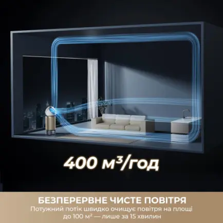 Потужний потік швидко очищує повітря на площі до 100 м3 — лише за 15 хвилин. Завдяки потоку очищеного повітря до 400 м3/год, швидкості очищення від формальдегіду 220 м3/год і динамічній циркуляції повітря пристрій швидко усуває шкідливі речовини з повітря, забезпечуючи вам вільне дихання щомиті.