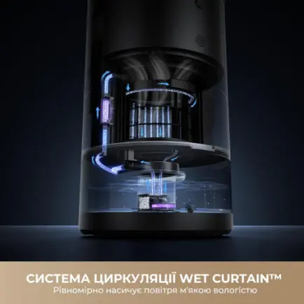 Вода з резервуара подається до вологої шторки, де природним чином випаровується у вигляді дрібної водяної пари. Потужний потік повітря проходить через вологу шторку, рівномірно розподіляючи зволожене повітря по всьому приміщенню. Надлишкова вода автоматично направляється назад у резервуар, не залишаючи вологого залишку.