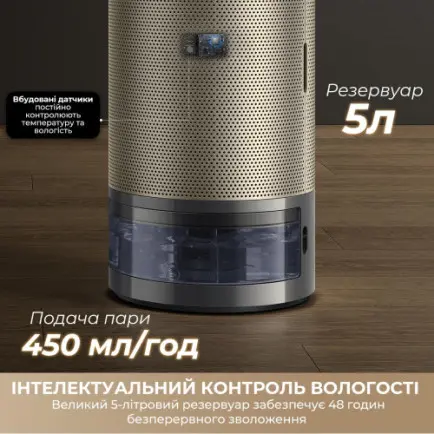 Завдяки великому резервуару для води об’ємом 5 л пристрій може безперервно зволожувати приміщення до 48 годин з високою продуктивністю зволоження 450 мл/год, легко задовольняючи потреби усієї оселі. У резервуар для води вбудовано високоефективний інгібітор накипу, який запобігає утворенню накипу з самого початку, зменшуючи витрати коштів і часу на очищення та обслуговування пристрою. Розумні вбудовані датчики постійно контролюють температуру й вологість у приміщенні та автоматично підтримують їх на комфортному рівні, щоб ви дихали здоровим повітрям цілодобово.
