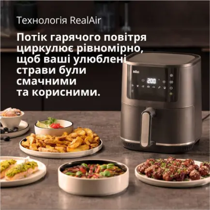 Надзвичайно гаряче повітря циркулює навколо вашої їжі, щоб отримати хрумкі продукти, які все ще залишаються ніжними всередині – з меншим додаванням олії на 90%, порівняно з приготуванням картоплі у звичайній фритюрниці.
