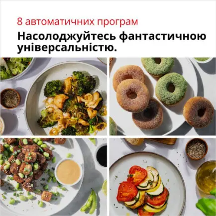 Автоматично встановлюйте час та температуру, щоб легко та якісно готувати улюблені страви. Смачні страви готуються майже самостійно завдяки автоматичним програмам приготування: заморожена картопля фрі, картопля, овочі, курка, риба, м'ясо, тістечка, розігрів.