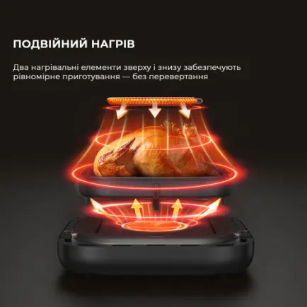 FD10 Pro забезпечує більш рівномірне запікання, порівняно з одним джерелом тепла. Отже, необхідність перевертати їжу під час приготування значно знижується. Удосконалена технологія подвійного нагріву не тільки підвищує якість запікання, а й забезпечує економію енергії до 20% та ступінь знежирення м’яса до 88%.