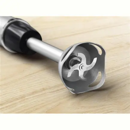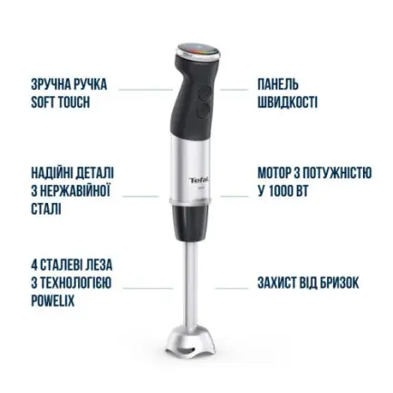 Сучасний прилад з функціями для покращення процесу змішування: ергономічна ручка з м’яким покриттям, міцний металевий корпус та захист від розбризкування.