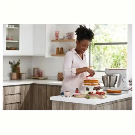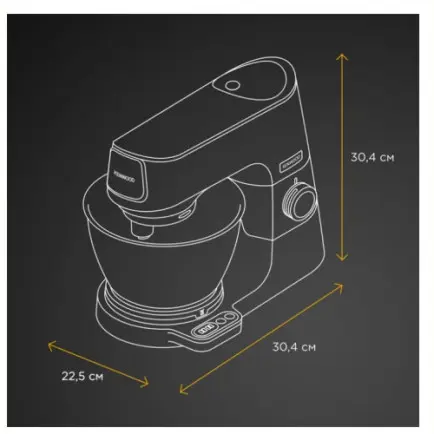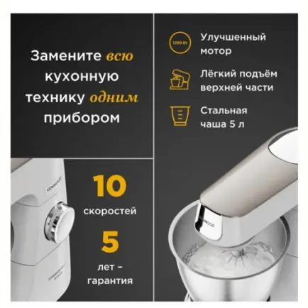 Кухонна машина Kenwood KVC 65.001 WH Titanium Chef Baker з перших же хвилин знайомства притягує до себе увагу. І це не дивно, адже настільки здавалося б вже буденна техніка для нас, може бути компактною, високопродуктивною і просто приємною на вигляд. Створена дана машина виключно з міцних матеріалів, а основа корпусу - високоякісний метал, який витримує всі процеси приладу і не деформується. Повертаючись до розміру, кухонна машина має маленькі габарити, що дозволяє розмістити її в будь-якому зручному для вас куточку кухні.