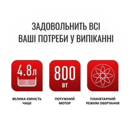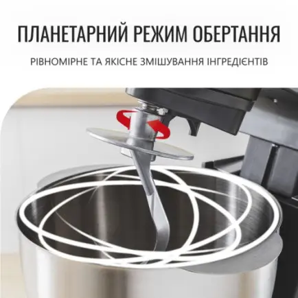 Планетарний рух забезпечує винятково гладкі та рівномірні результати - планетарний рух забезпечує обертання насадки навколо своєї осі й одночасно по колу всієї чаші у зворотному напрямку для змішування всіх інгредієнтів.