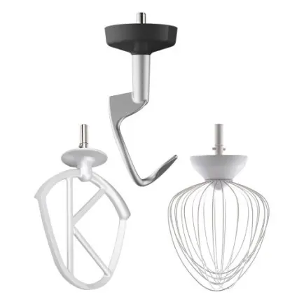 У стандартній комплектації представлені 3 основних насадки (К-образна, віночок і гак для тіста) і насадки для приводів (блендер і м’ясорубка). Також можна докупити окремо ще понад 20-ти аксесуарів різного призначення, вибравши їх в розділі на нашому сайті.