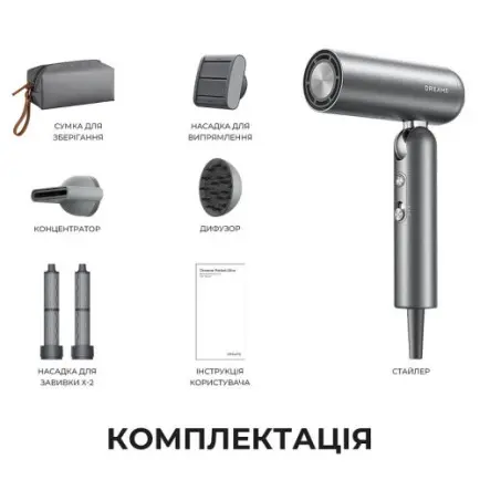 стайлер, насадка для гладкой прически, диффузор, концентратор, насадка для завивки х2, чехол для хранения |