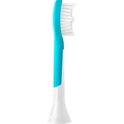 Ця насадка створена для дбайливого очищення дитячих зубів. Вона має м’які щетинки для ніжного очищення, контурний профіль для відповідності формі зубів дитини та м’яку гумову основу для додаткового комфорту у роті. Доступна також у меншому розмірі для дітей віком від 3 років.