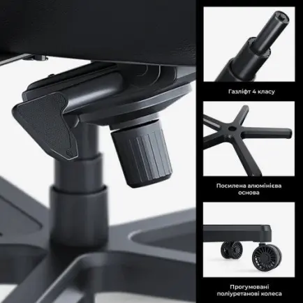 Спинка крісла відхиляється на 135 °, а режим хитання дозволяє нахилитися на додаткові 15 °. Газліфт 4-го класу забезпечує плавне регулювання висоти на 6,5 см, що підходить для користувачів зростом від 150 до 210 см.