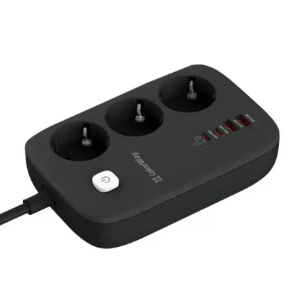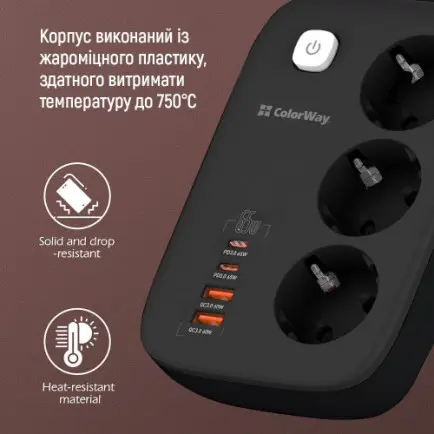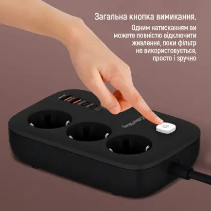 Компактний подовжувач з трьома розетками 220В і з 2 портами USB, що підтримують технологію швидкої зарядки Quick Charge 3.0/4.0, і 2 USB-C PD з підтримкою протоколів PD (Power Delivery) 2.0/3.0, 65W PPS; APPLE FAST CHARGE; SAMSUNG 5V-2A/AFC/SFC; QC2.0/3.0/4.0+; HUAWEI FCP/SCP, VOOC, XIAOMI 27W TURBO CHARGING. Пристрій має продуману конструкцію, що дозволяє одночасно підключати не тільки електроприлади, а й одночасно заряджати до чотирьох мобільних пристроїв без будь-яких труднощів. При цьому технологія інтелектуального контролю визначає та забезпечує оптимальну напругу для кожного девайсу, тоді як спеціальний чіп захищає від навантаження, короткого замикання чи перегріву. Зарядний пристрій відноситься до нового покоління, в якому замість кремнієвих транзисторів використовують нітрид галію. Завдяки цьому зарядка практично не нагрівається, споживає менше енергії і заряджає гаджети швидше за звичайні адаптери живлення. Максимальної потужності 65 Вт вистачить, щоб виробляти підзарядку не лише невеликих гаджетів, а й таких енергоємних пристроїв, як ноутбуки. Подовжувач оснащений захисними шторками за технологією Child Security Door, а також із зручною кнопкою включення та вимикання та LED індикацією. Контактні групи розеток виготовлені з високоякісного мідного сплаву. Корпус виконаний із жароміцного пластику, здатного витримати температуру до 750°C.