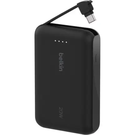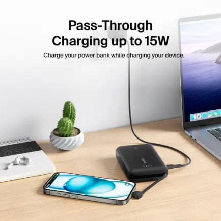 Вбудований кабель USB-C з’єднується з додатковим портом USB-C потужністю 20 Вт, що дозволяє одночасно заряджати два пристрої спільною потужністю 15 Вт. Переконайтеся, що ваш смартфон і планшет живляться незалежно від того, де ви знаходитесь.