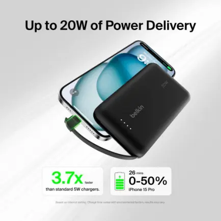 Елемент ємністю 10000 мА/год заряджає iPhone 15 Pro від 0 до 50% всього за 26 хвилин і забезпечує до 43 годин відтворення. Тримайте свої пристрої живими довше, залишаючись на зв’язку та розважаючись у дорозі.