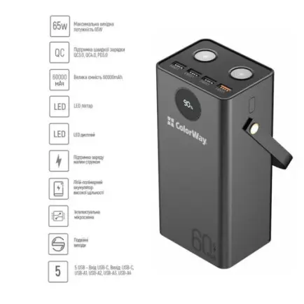 Характеристики Універсальна мобільна батарея ColorWay Powerful 60000mAh Black (CW-PB600LPA5BK-PDD)