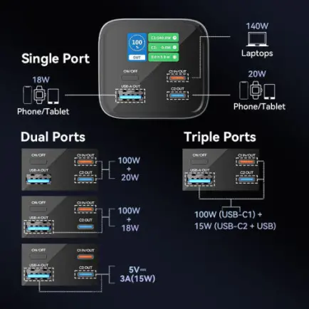За одночасної роботи трьох зарядних портів ви отримаєте зарядну потужність 100 Вт на порті USB-C1 і до 15 Вт на портах USB-A і USB-C2.