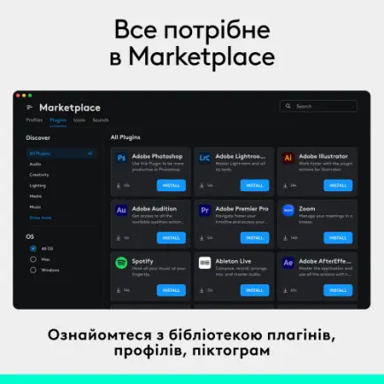 Marketplace у програмі Logi Options+ надає вам доступ до сотень плагінів, шаблонів профілів, пакетів піктограм тощо.