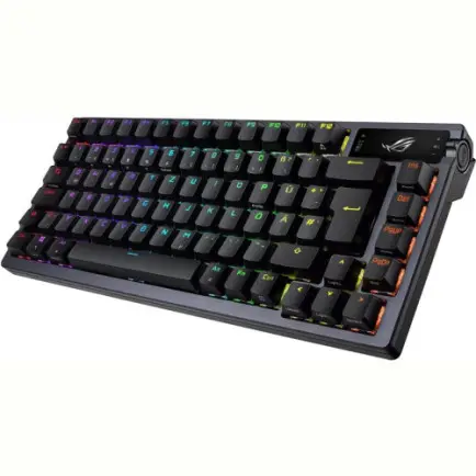 Геймерська клавіатура ROG Azoth: можливість персоналізації, формфактор 75%, пружна прокладка у кріпленні верхньої металевої пластини, три демпфувальних шари, попередньо змащені механічні перемикачі ROG NX з можливістю гарячої заміни, стабілізатори клавіш, двокомпонентні PBT-ковпачки, набір для змащування, три режими підключення, технологія SpeedNova у режимі 2,4 ГГц, OLED-дисплей, 3-позиційний регулятор, три кути нахилу, підтримка Mac.