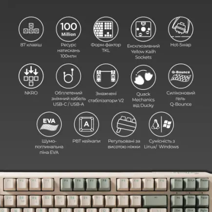 - Зручність: Клавіатура має знімний обплетений кабель USB-A/USB-C довжиною 1.8 м і два рівні ніжок для регулювання висоти, що дозволяє налаштувати оптимальний кут нахилу.