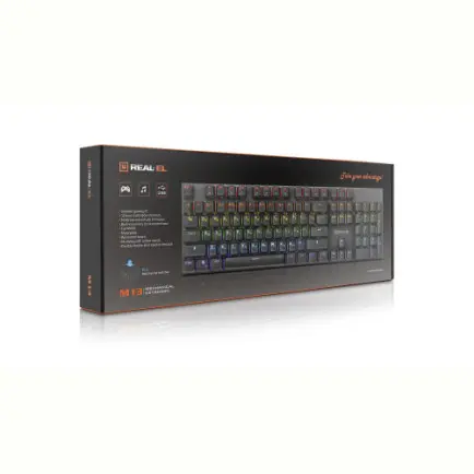 Висока надійність, швидкий час реагування, необмежена кількість одночасних натискань клавіш відрізняють механічну ігрову клавіатуру REAL-EL M 13. Дана модель обладнана різнокольоровим підсвічуванням з різноманітними комбінаціями, в кожній комбінації по 4 види підсвічування, які змінюються при повторному натисканні відповідної комбінації. Усього 20 видів підсвічування, що дозволяє створити на ігровому місці як агресивне середовище для онлайн-шутерів, так і атмосферу зосередження та концентрації для квестів та стратегій.