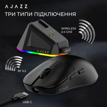 Высокопроизводительная мышь Ajazz AJ159P MC предлагает гибкие возможности подключения: проводной режим USB-C, 2.4GHz и Bluetooth. В комплект входит Type-C кабель, обеспечивающий быструю и эффективную зарядку. Переключение режимов производится с помощью кнопки на задней стороне мыши.