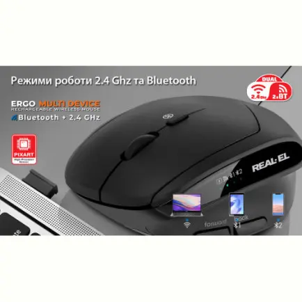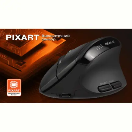REAL-EL RM-490W — сучасна безпровідна анатомічна миша, що поєднує комфорт, тишу та універсальність у щоденній роботі.