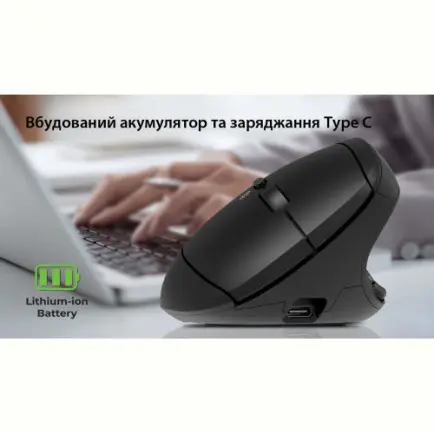 Мишка оснащена вбудованим акумулятором 400 мА·год із заряджанням через USB Type-C та індикатором заряду.
