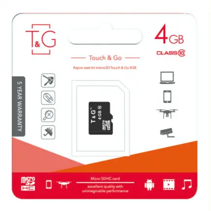 Карта памяти microSDHC T&G изготовлена из материалов высокого качества, что делает её устойчивым к воздействию температуры, погодных условий и влаги. Простота использования, надежность и безотказность в работе – главные достоинства этой карты памяти.