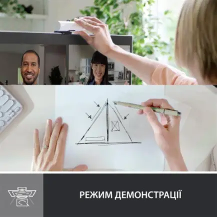 Використовуйте інноваційний режим демонстрації: просто нахиліть камеру вниз і показуйте іншим свої ескізи, незавершені роботи та будь-які інші об’єкти на вашому столі. У комплект поставки входить кріплення, що оснащене накладкою з мікроприсосками. З його допомогою ви зможете зафіксувати веб-камеру на задній панелі монітора і легко регулювати її положення однією рукою. Завантажте безкоштовну програму Logi Tune, щоб увімкнути режим демонстрації.