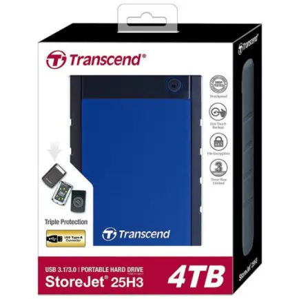 Зовнішній жорсткий диск 2.5" 4TB Transcend (TS4TSJ25H3B) має надійний ударостійкий корпус, який забезпечує найвищий рівень захисту від випадкових падінь для того величезного обсягу інформації, який дозволяє зберігати їх підвищена місткість.