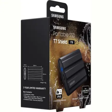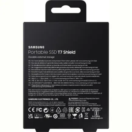 Компанія додала два окремих бар’єри для особливого захисту USB-порту від таких факторів навколишнього середовища, як пил і вода. Тут підтримується 256-бітне жорстко шифрування AES. Samsung використовує на третину менше упаковкового матеріалу, що в цілому знижує викиди вуглекислого газу. T7 Shield має габаритні розміри 59 х 88 х 13 мм, що відносно компактно для такого обсягу пам’яті і в порівнянні з іншими твердими накопичувачами. Тривимірний алюмінієвий корпус і гумова оболонка дозволяє вам не боятися в тому випадку, якщо пристрій випадково зачепить і він впаде. Різіна запобігає з’явленню подряпин і плям, а також захищає від помилок.