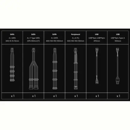 | Довжина кабеля | MB (20+4) pin - 620 мм; CPU (4+4) pin - 700 мм; CPU 8 pin - 700 мм; PCIE (6+2) pin - 3 х 650 мм; PCIE (6+2) pin - 650 + 100 мм; 16 PIN PCIe GEN5 - 650 мм; SATA - 300 + 15 + 15 + 15 мм; SATA - 400 + 150 + 150 + 150 мм; SATA - 2 х (375 + 150 мм); Molex - 50 |
