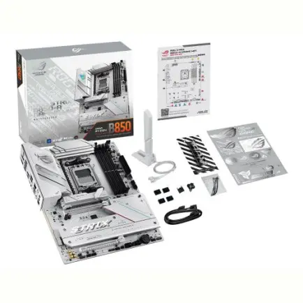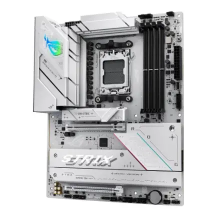 ROG Strix B850-A виділяється своєю вражаючою білою друкованою платою, пропонуючи свіжу та сучасну естетику, яка ідеально доповнює майже будь-яку систему. Відповідні металеві радіатори покращують його чистий, чіткий вигляд, а тонке RGB-підсвічування на кожусі вводу/виводу дозволяє зберегти елегантний, стриманий зовнішній вигляд або продемонструвати сміливий, яскравий дизайн.