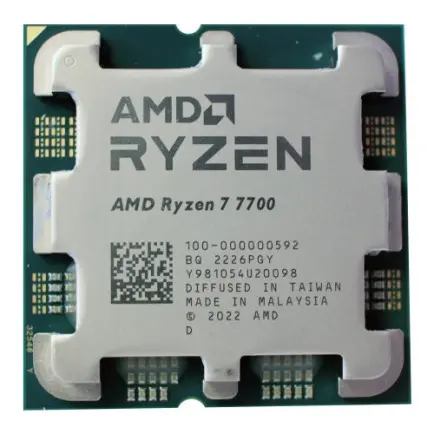 Ryzen 5 7700 – десктопний процесор від компанії AMD для сокету AM5, який має 8 ядер та 16 потоків. Його базова частота – 3800 МГц, але підтримка технології Turbo Core дозволяє автоматично розганятися до 5300 МГц. Цей чіп має інтегровану графіку AMD Radeon Graphics, а розмір кешу 3-го рівня становить 32 МБ.