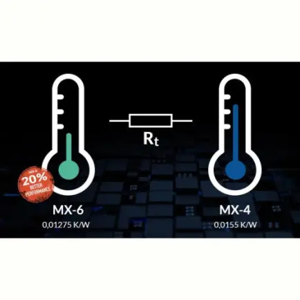 Завдяки покращеному складу ARCTIC MX-6 має помітно менший термічний опір, ніж MX-4. Основою для розрахунку є різниця температур між основою радіатора і джерелом тепла (C) по відношенню до прикладеного теплового навантаження (Вт), що також призводить до одиниці C/W. Чим вищий термічний опір, тим гірше передається тепло через шар TIM. Тому утеплювачі, наприклад, завжди мають особливо високий термічний опір, а матеріали для термоінтерфейсу – особливо низький.