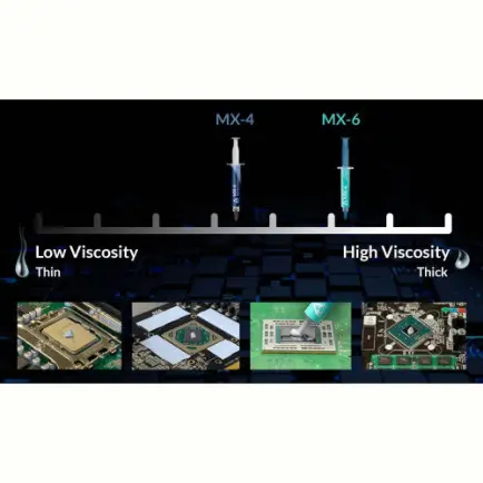 Завдяки новому складу MX-6 є придатною термопастою для багатьох сценаріїв застосування. Відмінні невисихаючі та нестікаючі властивості забезпечують стабільну довготривалу роботу. Його в'язкість запобігає витоку через ефект викачування. Він також підходить для сценаріїв прямого охолодження корпусу, які зустрічаються, наприклад, у графічних картах чи GPU консольних процесорів.