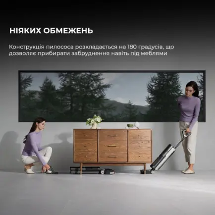 С Dreame H12 Pro Flex больше не придется разделять сеанс на влажную уборку со шваброй и сухую с пылесосом или веником. Здесь высокая сила всасывания 18 000 Па прекрасно справляется с мусором любой структуры. А скоростной бесщеточный двигатель позволяет тщательно протирать поверхность в течение 50 минут.