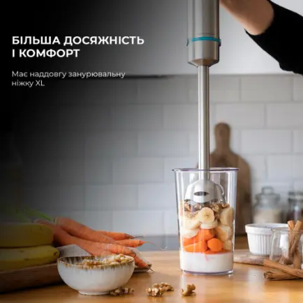 Длинная ножка XL для большей досягаемости и комфорта при приготовлении блюда позволяет смешивать как в больших кастрюлях и даже высоких стаканах. Кроме того, погружной блендер гарантирует чистоту на кухне, предотвращая попадание брызг на кухонную поверхность.