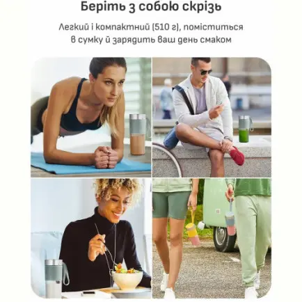 На работу, в спортзал, на прогулку или в путешествие - Lightmix легко поместится даже в небольшую сумку. Его вес всего 510 г, поэтому он не утяжеляет, а заряжает ваш день пользой и вкусом.