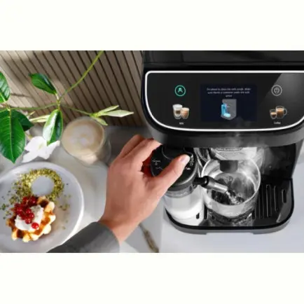 Они покорили многих, пожалуй, даже больше, чем чистый эспрессо. Потому и не удивительно, что ваша новая кофемашина может готовить коктейли с изящной молочной пенкой. Латте, капучино, макиято или даже просто горячее молоко. Буквально в одно нажатие сенсорной кнопки. Не забудьте подключить автоматический капучинатор и установить желаемую толщину пенки с помощью механического поворотного переключателя. Молоко мгновенно сбивается в пенку потоком перегретого пара. После завершения цикла приготовления кофемашина предложит автоматически промыть систему горячей водой, чтобы исключить засор остатками кофе и молока.