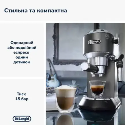 Изящный современный дизайн, сочетание матового черного цвета и хромированных деталей – такое устройство заслуживает вашего внимания. Даже на очень маленькой кухне кофеварка DeLonghi EC 685 найдет свое место.