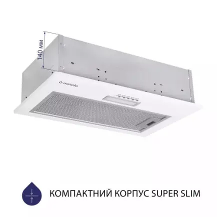 Модель выполнена в универсальном белом цвете, подходящем для большинства современных интерьеров. Корпус изготовлен из металла с термостойким покрытием, устойчивым к жиру и высокой температуре. Кнопки управления встроены в нижнюю панель и имеют эргономичную форму. Общий вид вытяжки минималистичен и лаконичен.