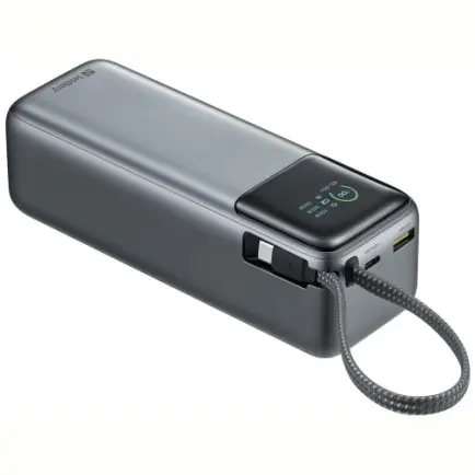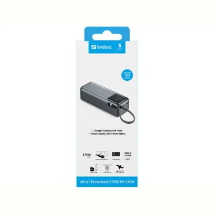 Sandberg All-in1 Powerbank 27000 PD 240W для тех, кто требует максимальной производительности. Со встроенным кабелем USB-C, портом USB-C и USB-A, вы можете заряжать свой ноутбук, смартфон и другие устройства одновременно – с невероятной общей мощностью до 240 Вт. Умный цветной дисплей предоставляет полную информацию: видите емкость, энергопотребление и процесс зарядки в реальном времени. И с 27000 мАч, он все еще в пределах дозволенного для перевозки в салоне самолета. Чистая мощность упакована элегантно и эффективно.