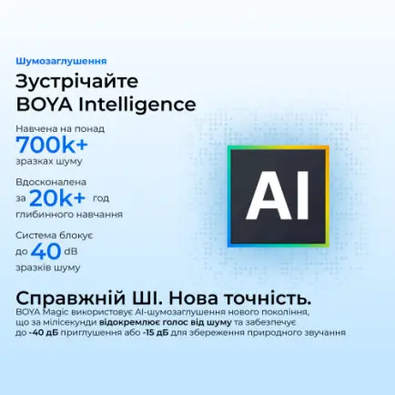 Технология True AI Noise Cancellation от BOYA – это квантовый скачок в борьбе с фоновыми шумами. Система, натренированная более чем на 700 000 образцов шумов и 20 000 часов глубокого обучения, интеллектуально отделяет ваш голос от окружающего шума за миллисекунды.