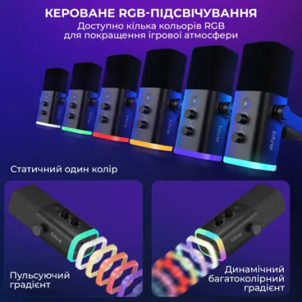 RGB подсветка в микрофоне FIFINE AM8T Ampligame открывает перед вами безграничные возможности для создания уникальной атмосферы в вашем студийном пространстве. Благодаря трем режимам подсветки вы сможете настроить атмосферу в соответствии с вашим настроением и типом контента, который вы создаете. Эта особенность позволит вам выделиться из других и создать неповторимую атмосферу вашей рабочей или игровой зоны.