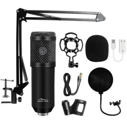 Игровой стрим микрофон Media-Tech профессиональный набор XLR – это набор для потоковой и студийной записи звука. Он включает в себя конденсаторный микрофон, регулируемую настольную подставку, поп-фильтр, антивибрационную корзину, губчатый обтекатель, наружную звуковую карту и проводку.