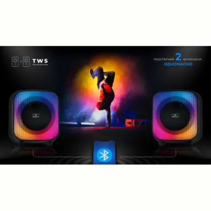 Подключай смартфон через Bluetooth, вставляй флешку или карту памяти, используй AUX – у тебя всегда есть выбор, как слушать любимую музыку. А если хочешь еще больше звука – активируй режим TWS, объедини две колонки в одну беспроводную 130 Вт стереосистему.