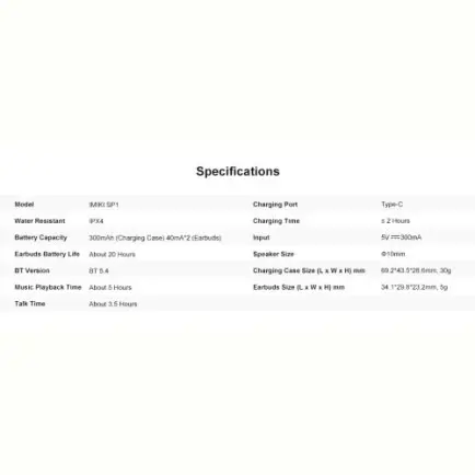 IMIKI SP1 – это стильные и удобные беспроводные наушники, предназначенные для комфорта и отличного звучания. Эргономичная форма обеспечивает удобную посадку, а легкая конструкция позволяет комфортно носить их в течение длительного времени. Компактный зарядный кейс имеет привлекательный дизайн и легко помещается в карман или сумку.