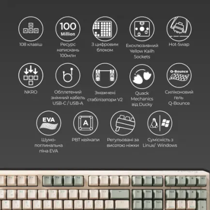 – Дизайн: Клавиатура создана согласно философии Ducky «QUACK» Mechanics, сочетающей эстетику, функциональность и надежность, а также учитывающую приятную акустику.