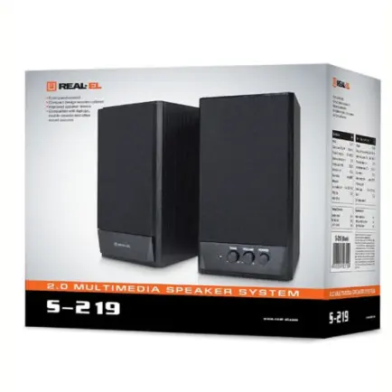 Акустическая система (АС) REAL-EL S-219 предназначена для воспроизведения музыки и озвучивания игр, фильмов и проч. АС может быть подключена практически к любым источникам аудиосигнала (CD/DVD-проигрывателям, телевизору, ПК и т. п.) без использования дополнительного усилителя мощности.