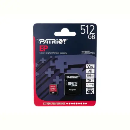 Характеристики Карта памяти MicroSDXC 512GB UHS-I/U3 Class 10 Patriot EP A1 R90/W80MB/s + SD-adapter (PEF512GEP31MCX)