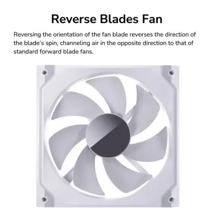Изменение ориентации лопастей вентилятора меняет направление вращения на противоположное, направляя воздух в направлении, противоположном движению стандартных вентиляторов с направленными вперед лопастями.